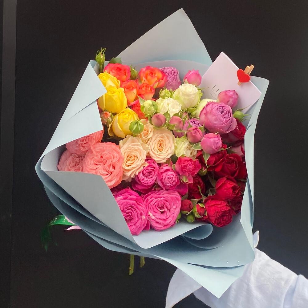 Упаковка дизайнерская - 3 шт. Пионовидная кустовая роза - 9 шт. Открыточка с вашими пожеланиями - 1 шт. инструкция по уходу за цветами - 1 шт.